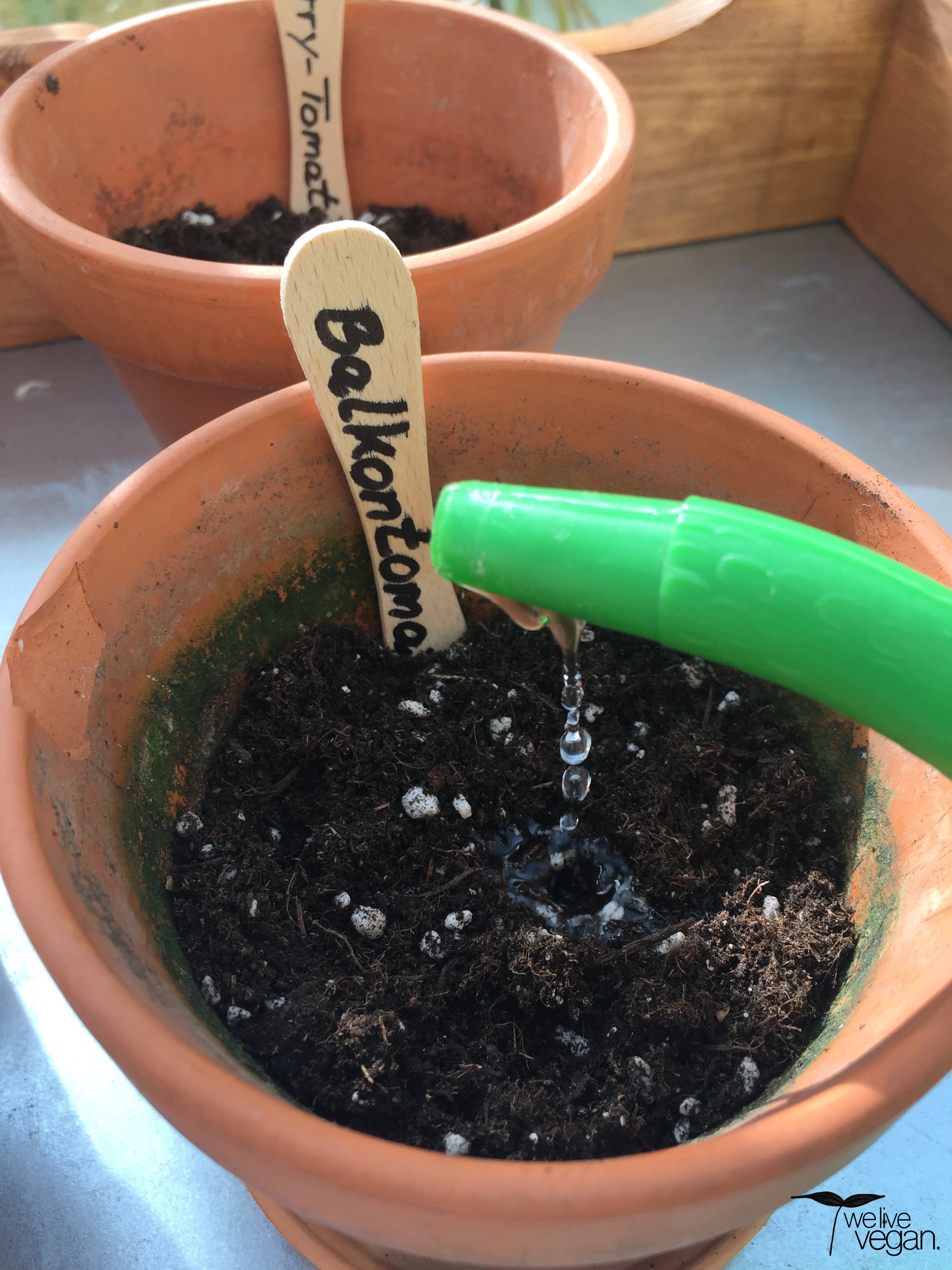 Dann habe ich die Erde etwas mit den Fingern angedrückt, je Topf drei Samen hinein gelegt und leicht mit Erde bedeckt. Nun gibt man vorsichtig Wasser hinzu bis die Erde gut feucht ist. Staunässe muss unbedingt vermieden werden! Dazu sollten die Töpfchen am Boden ein Loch besitzen, durch das überschüssiges Wasser entweichen kann. Zum Schluss habe ich die Holzstäbchen mit Namen und Datum versehen und an den Rand der Töpfchen in die Erde gesteckt.